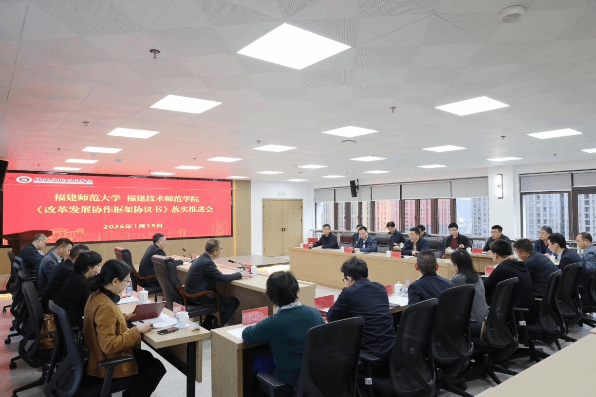 会议于1月15日在我校林联兴科技楼集贤厅举行。福建师范大学校长郑家建、副校长陈晓斌,我校党委书记涂荣、校长吴克寿、副校长姜兴山参加会议。会议由涂荣主持。